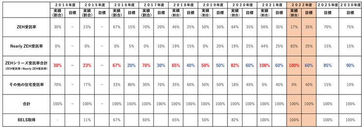 弊社は、2014年より本格的にゼロエネルギー住宅に取り組み、2016年にZEHビルダーとして登録されました。2021年には、ZEHシリーズの受託率は100%に達しました。
